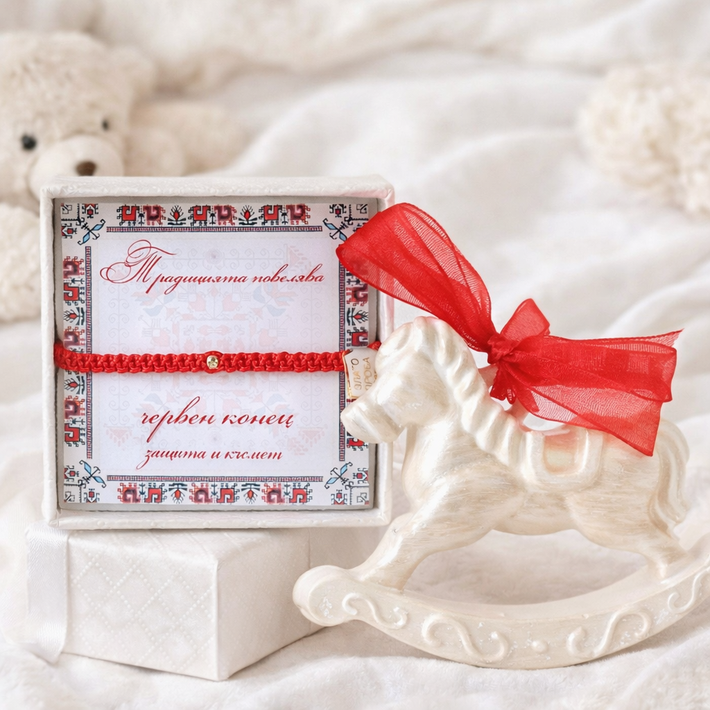 Представяме ви изключително нежен подарък за новородено бебе. Първата гривничка на бебето. Създадохме най-нежната гривна с червен конец и вплетено златно мънисто 14К проба 585 италианско злато. Луксозна бижутерска нишка червен конец, абсолютно подходящ за най-нежните ръчички. Кутия с подаръци за новородено бебе, подходяща за подарък за погача, кръщене, рожден ден - нежна гривна с червен конец и злато 14К и ръчно изработено керамично конче. Гривната получавате със сертификат. Ръчно плетена в нашето ателие с много любов и внимание. Размера се регулира и е подходящ от новородено до 1.5 год.